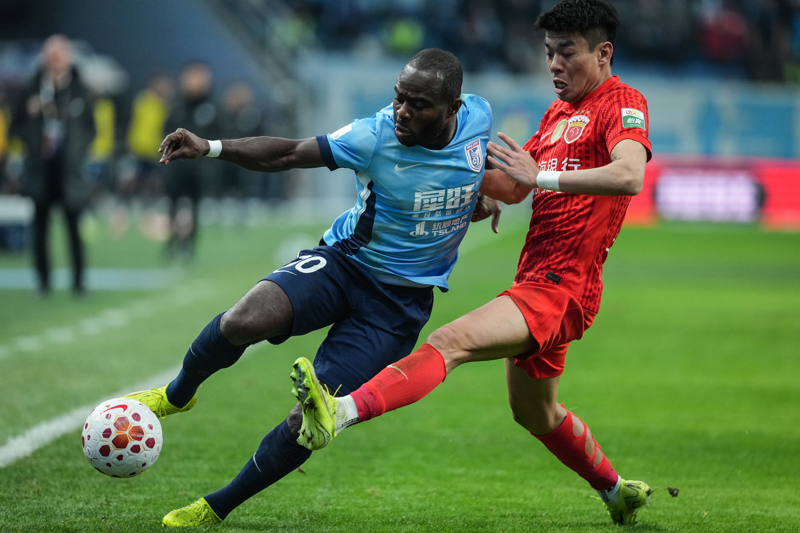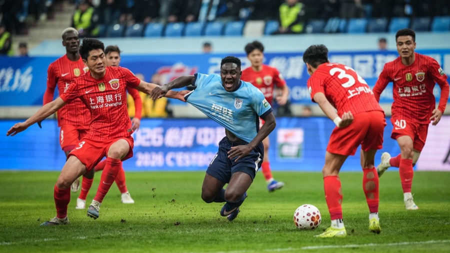 新华社照片,大连(辽宁),2026年3月20日\n 3月20日,大连英博队球员阿奇姆彭(左)在比赛中带球突破。\n 3月20日,在辽宁大连举行的2026赛季中国足球协会超级联赛第三轮比赛中,大连英博队主场1比0战胜上海海港队。\n 新华社记者 潘昱龙 摄
